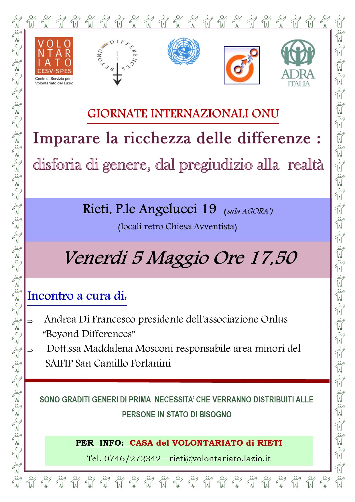 In occasione delle Giornate Internazionali ONU ADRA Italia‚ Beyond Differences in collaborazione con CESV e SPES Centri di Servizio per il Volontariato del Lazio organizzano per venerdì 5 maggio alle 17.50 l'incontro Imparare la ricchezza delle differenze: disforia di genere‚ dal pregiudizio alla realtà. La sede sarà presso i locali dietro la Chiesa Avventista in Piazzale Angelucci‚ 19 (sala Agorà). Previsti gli interventi di Andrea Di Francesco‚ Presidente di Beyond Differences e Maddalena Mosconi del SAIFIP San Camillo Forlanini. Sono graditi generi di prima necessità che verranno distribuiti alle persone in stato di bisogno. Per informazioni è possibile contattare la Casa del Volontariato di Rieti tel. 0746/272342 oppure scrivere a: rieti@volontariato.lazio.it