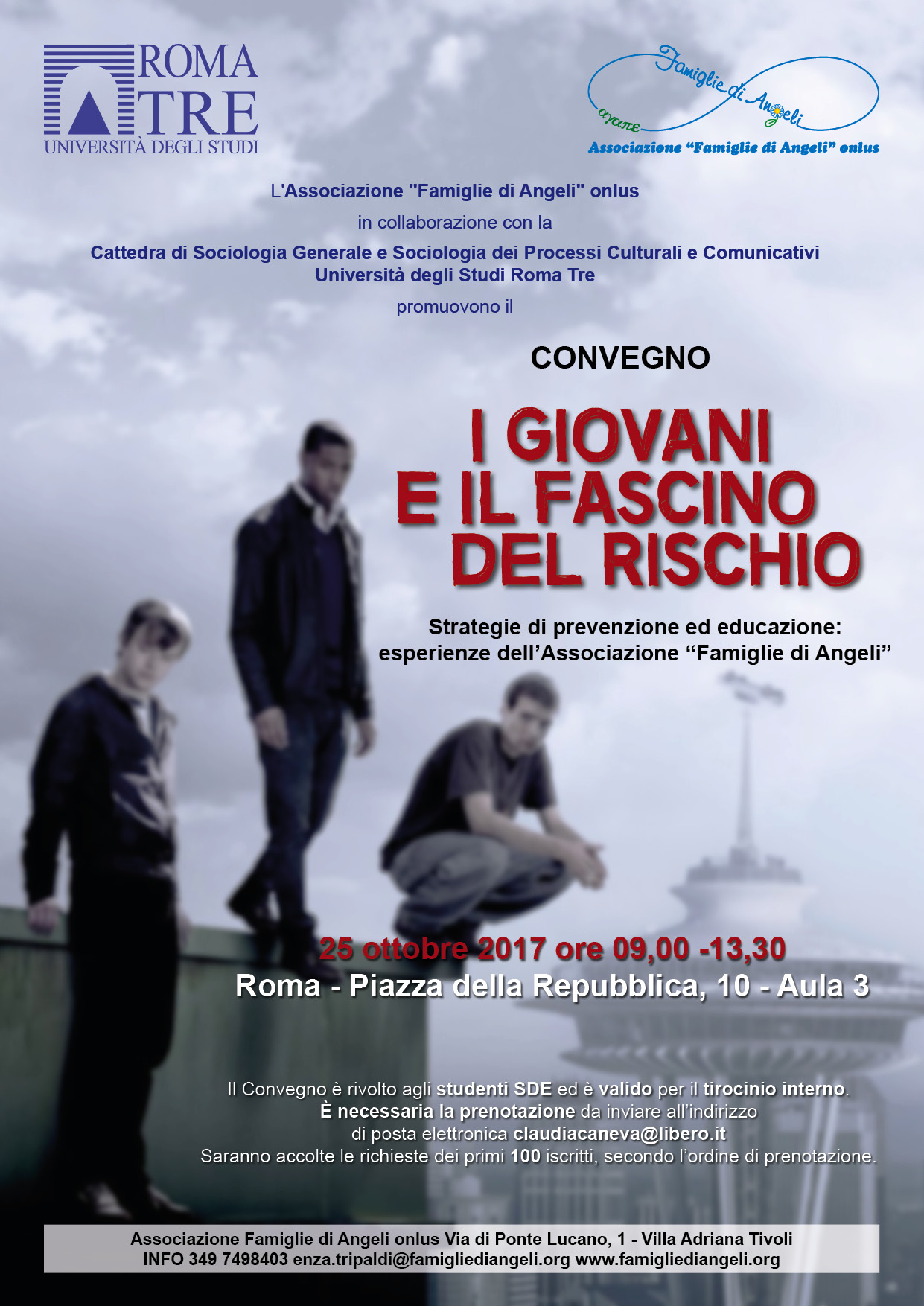 Il 25 ottobre 2017‚ alle ore 09‚00 nella sede universitaria di piazza della Repubblica a Roma‚ si terrà il Convegno sul tema "I giovani e il fascino del rischio". Strategie di prevenzione ed educazione: esperienze dell'Associazione "Famiglie di Angeli"onlus. Tale incontro è organizzato dall'Associazione "Famiglie di Angeli" in collaborazione con la Cattedra di Sociologia Generale e Sociologia dei Processi Culturali e Comunicativi dell'Università degli Studi Roma Tre. E’ rivolto in particolare agli studenti della Facoltà di Scienze dell'Educazione‚ quali futuri professionisti del processo educativo. La loro partecipazione al convegno avrà infatti validità di tirocinio interno‚ al fine dei crediti formativi. L'associazione‚ infatti‚ si avvale di esperti della relazione d'aiuto‚ di docenti universitari‚ di dirigenti della Polizia Stradale e dell'Automobile Club Italia‚ che si confronteranno sulle ragioni e sulle possibili modalità di prevenzione delle condotte a rischio dei giovani‚ con un'analisi sociologica‚ psicologica e giuridica dei fenomeni. Nell’occasione‚ l'Associazione "Famiglie di Angeli" presenterà un'iniziativa per premiare‚ con due Corsi di Guida Sicura‚ gli studenti che invieranno un progetto di tesi nelle discipline di Sociologia generale o Sociologia dei processi culturali e comunicativi o di Psicologia dello sviluppo‚ rispondente alle tematiche affrontate nel convegno. I due corsi di Guida Sicura sono offerti dalla Direzione Generale ACI di Vallelunga‚ Il convegno si inserisce tra le attività che l'associazione promuove. "Famiglie di Angeli" presta particolare attenzione al mondo dei giovani ed è impegnata costantemente alla loro sensibilizzazione sulle conseguenze negative dei comportamenti a rischio. E' costituita da professionisti della relazione d'aiuto‚ da volontari e da genitori che hanno perso i figli‚ vittime di incidenti stradali. L'associazione realizza diverse attività per educare i giovani alla corretta percezione delle condotte a rischio e per facilitare la ripresa del cammino di vita di genitori che hanno subito il lutto per la perdita di un figlio. L'Associazione ha sede in Villa Adriana‚ in via di Ponte Lucano‚1 ed è aperta a tutti coloro che vogliano partecipare e sostenere tali attività.