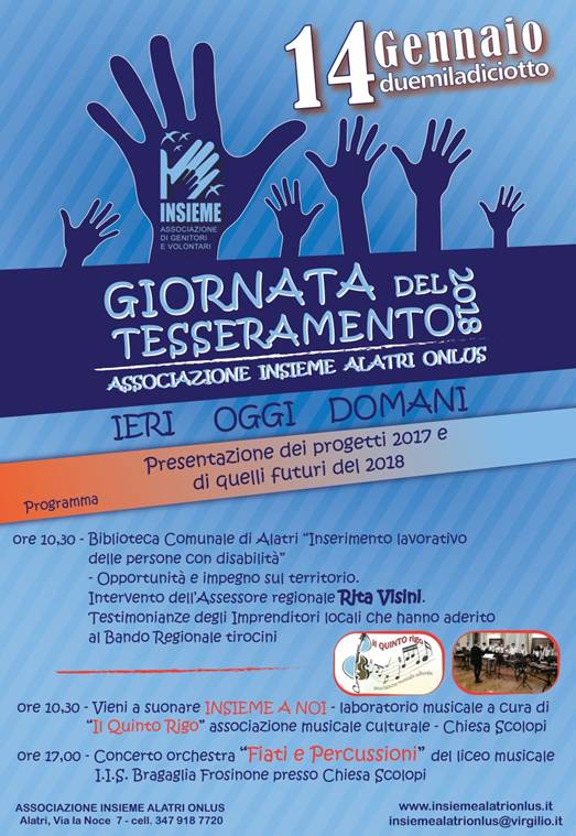 Domenica 14 gennaio a partire dalle ore 10.30 si terrà ad Alatri (FR) la Giornata del Tesseramento 2018 organizzata dall'Associazione Insieme Alatri onlus. In questa occasione avverrà la presentazione dei progetti svolti nel 2017 e di quelli futuri previsti per il 2018. Alle 10.30 presso la Biblioteca Comunale di Alatri si terrà l'incontro sul tema "Inserimento lavorativo delle persone con disabilità" valutando le opportunità e l'impegno sul territorio. In questo contesto è previsto l'intervento dell'Assessore Regionale Rita Visini. In contemporanea sempre alle 10.30 l'opportunità di suonare grazie all'associazione musicale culturale "Quinto Rigo" con un laboratorio musicale "Insieme a Noi" presso la Chiesa degli Scolopi. In ultimo alle 17.00 concerto orchestra "Fiati e Percussioni" del Liceo miscale Bragaglia di Frosinone sempre presso la Chiesa degli Scolopi. Per informazioni visita il sito dell'associazione www.insiemealatrionlus.it