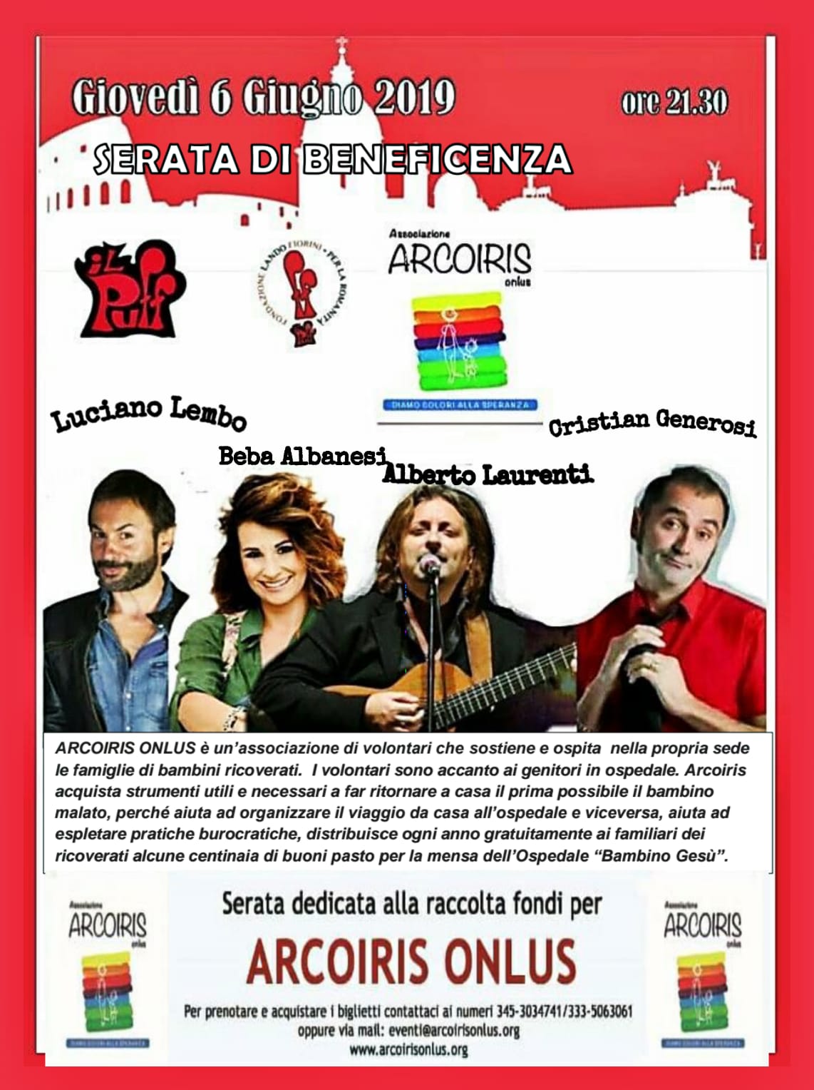 Il 6 giugno 2019 ore 21.30 presso il Teatro PUFF di Roma in Via Zanazzo Giggi‚ 4 si terrà uno spettacolo di cabaret messo in scena esclusivamente per Arcoirs Onlus. Sul palco del Puff‚ storico teatro-ristorante fondato da Lando Fiorini‚ quattro artisti (Luciano Lembo‚ Beba Albanesi‚ Alberto Laurenti e Christian Generosi) si avvicenderanno sul palco con gags‚ canzoni e stornelli‚ dando vita ad un divertentissimo spettacolo di Musica e cabaret. Per la prevendita dei biglietti e/o per qualsiasi informazione‚ contattare telefonicamente i numeri 333-5063061 (Gloriana) o 345-3034741 (Micaela) o via mail eventi@arcoirisonlus.org Parte del ricavato della serata sarà devoluto ad Arcoiris Onlus.