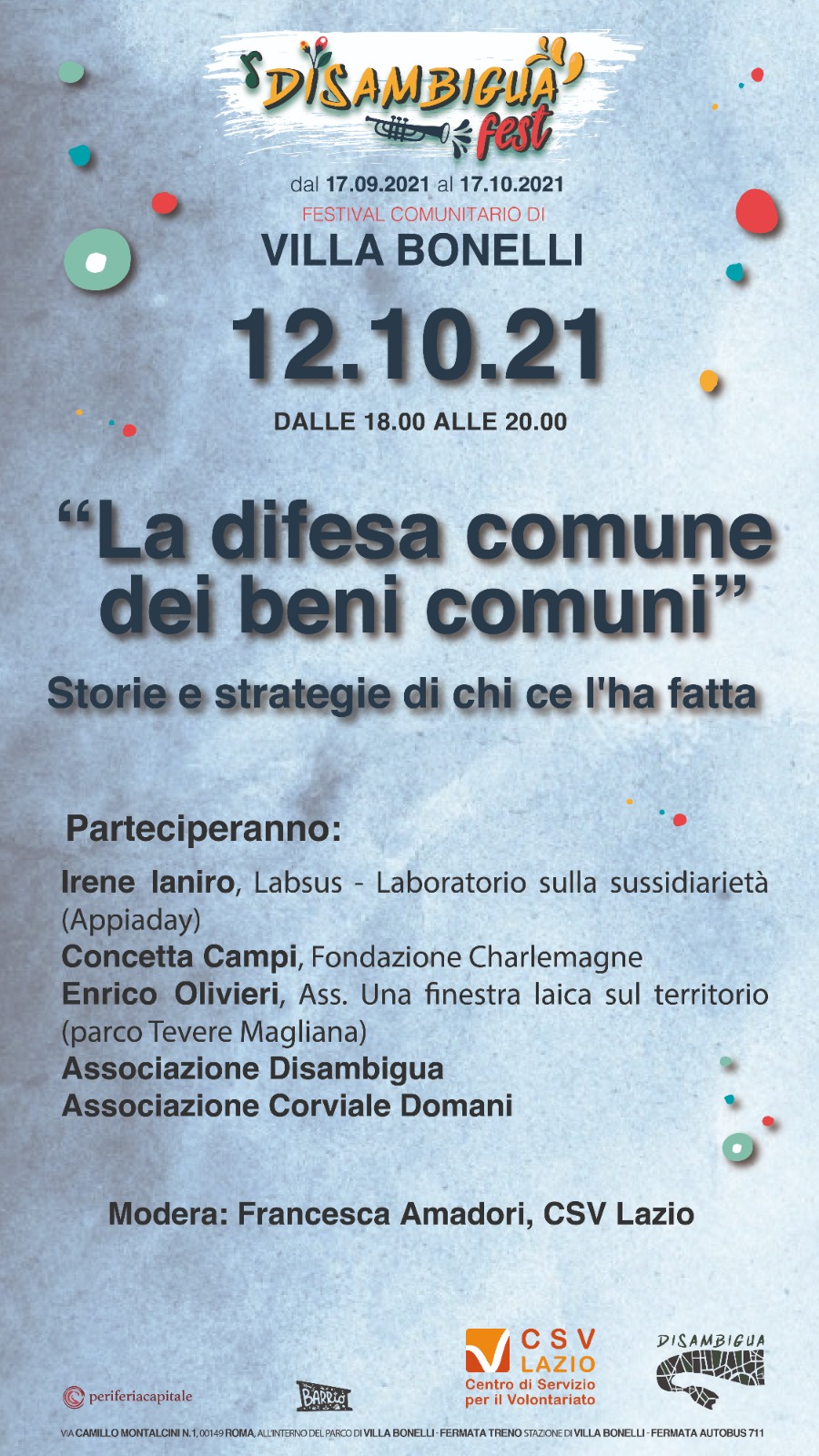 Martedì 12 ottobre‚ dalle 18 alle 20 presso il “Disambigua fest”‚ festival comunitario di Villa Bonelli‚ si terrà l’incontro “La difesa comune dei beni comuni- storie e strategie di chi ce l’ha fatta” Parteciperanno all'incontro: Irene Ianiro‚ Concetta Campi‚ Enrico Olivieri‚ Associazione Disambigua‚ Associazione Corviale Domani. Modera l’incontro Francesca Amadori‚ CSV Lazio.