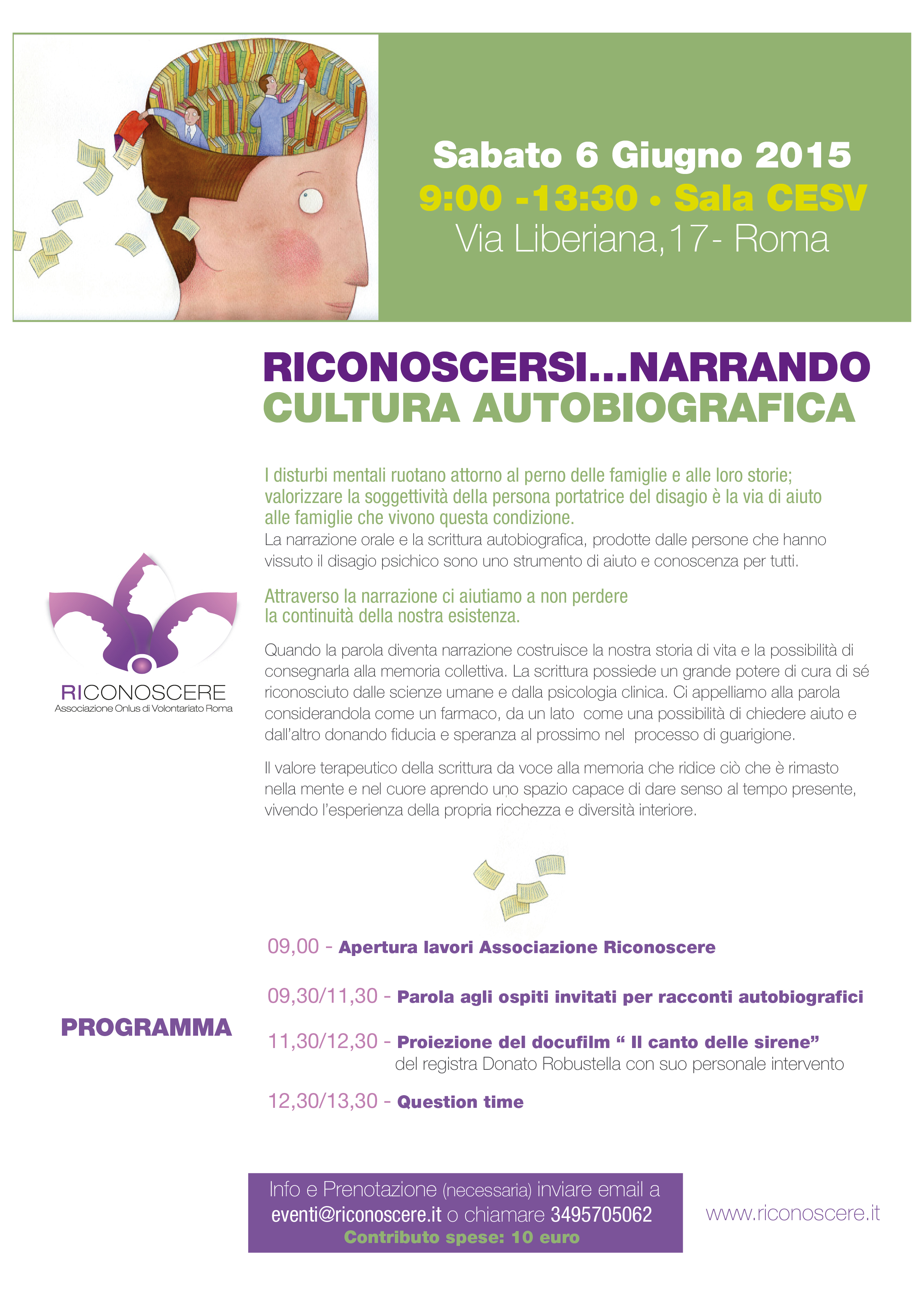 L’associazione Riconoscere onlus organizza un incontro relativo alla narrazione terapeutica del disagio mentale. I disturbi mentali ruotano attorno al perno delle famiglie e alle loro storie; valorizzare la soggettività della persona portatrice del disagio è la via di aiuto alle famiglie che vivono questa condizione.