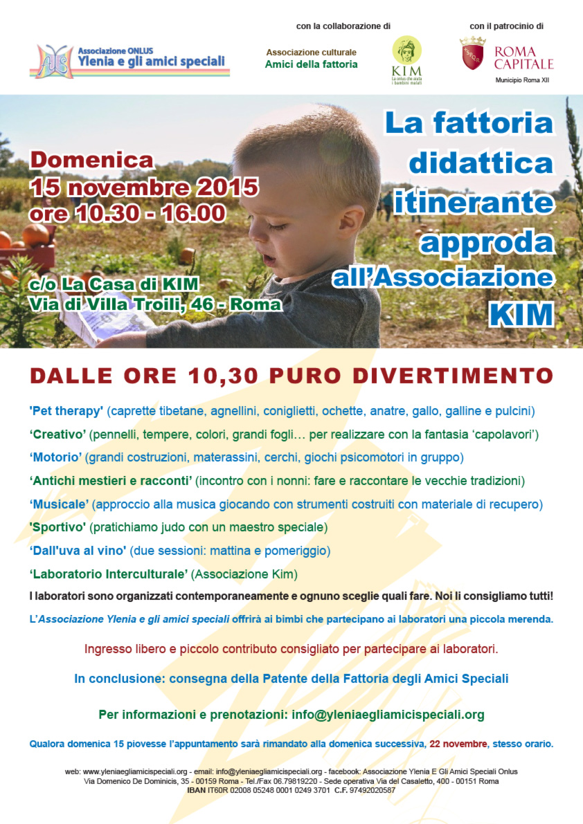 Domenica 22 novembre 2015 a partire dalle ore 10.30 presso La Casa di KIM in Via di Villa Troili‚ 46 a Roma si terrà l’iniziativa La fattoria didattica itinerante organizzata dall’associazione Ylenia e gli amici speciali in collaborazione con l’associazione culturale Amici della fattoria e con Kim onlus.