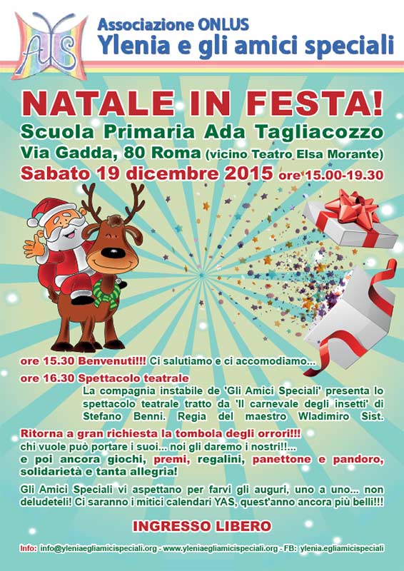 Un pomeriggio di festa per stare insieme e divertirsi prima del Natale: l’associazione Ylenia e gli Amici Speciali festeggia con operatori‚ soci e amici sabato 19 dicembre 2015 dalle ore 15.00 alle 19.30 presso la Scuola Primaria Ada Tagliacozzo in Via Gadda‚ 80 Roma (vicino Teatro Elsa Morante). Dopo i saluti iniziali la compagnia instabile de 'Gli Amici Speciali' presenta lo spettacolo teatrale tratto da 'Il carnevale degli insetti' di Stefano Benni. Regia del maestro Wladimiro Sist. Ritorna a gran richiesta la tombola degli orrori e poi ancora giochi‚ premi‚ regalini‚ panettone e pandoro‚ solidarietà e tanta allegria! Per informazioni: info@yleniaegliamicispeciali.org oppure visita il sito dell’associazione: www.yleniaegliamicispeciali.org