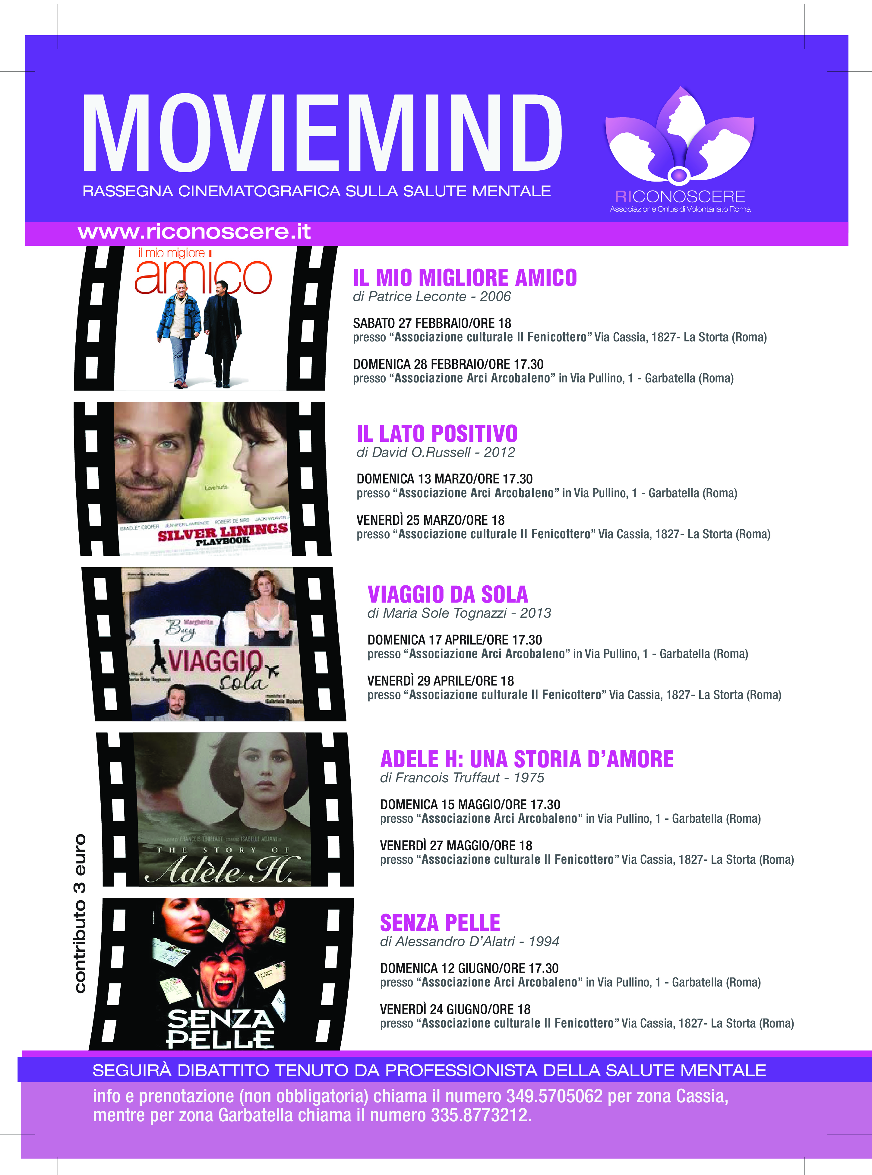 L' Associazione Onlus di volontariato Riconoscere invita alla rassegna cinematografica sulla salute mentale "MOVIE MIND". Sì può parlare di salute mentale e di problemi sociali attraverso un film? Grandi registi ci sono riusciti‚ trattando tematiche comuni a tutti‚ che consentono di ascoltare le emozioni e i pensieri. Per questo l'associazione ha organizzato il cineforum che inizia sabato 27 febbraio e prosegue fino a giugno. Dopo il film si terrà un dibattito con una professionista della salute mentale. I film verranno proiettati nella zona Cassia presso l'Associazione culturale Il Fenicottero in Via Cassia‚ 1827 mentre nella zona Garbatella presso l'Associazione Arci Arcobaleno in Via Pullino‚ 1. Per informazioni e prenotazioni per la zona Cassia è possibile chiamare il tel. 349.5705062 mentre per la zona Garbatella tel. 335.8773212