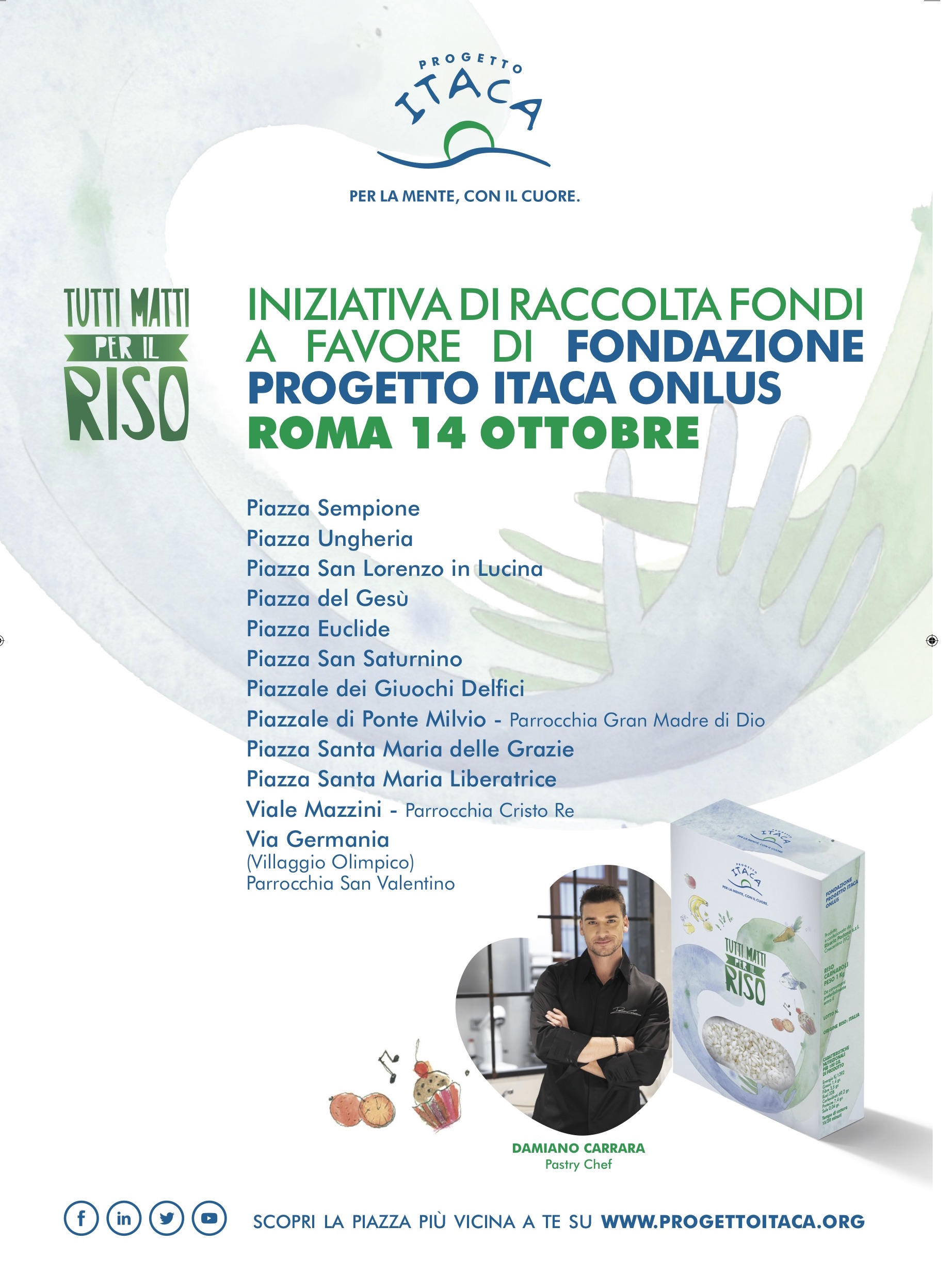 Domenica 14 ottobre‚ in occasione della Giornata mondiale della Salute Mentale promossa dall’OMS (Organizzazione Mondiale della Sanità)‚ si terrà l'iniziativa Tutti matti per il riso. Sarà possibile incontrare i volontari di Progetto Itaca e sostenerne le attività con una donazione‚ in cambio di una confezione da 1kg di pregiato riso Carnaroli in più di 70 piazze in 19 città italiane (Milano‚ Bari‚ Bologna‚ Catanzaro‚ Como‚ Firenze‚ Genova‚ Lamezia‚ Lecce‚ Napoli‚ Padova‚ Palermo‚ Parma‚ Perugia‚ Rimini‚ Roma‚ Torino‚ Verona‚ Vicenza). Per rendere ancora più speciale questo gesto di solidarietà‚ in regalo l’esclusiva ricetta della Torta Riso e Ricotta di Damiano Carrara. Con i fondi raccolti l'associazione potrà continuare a offrire servizi gratuiti di ascolto e supporto a chi soffre di disturbi mentali e aprire nuove sedi sul territorio. Per saperne di più: www.progettoitaca.com