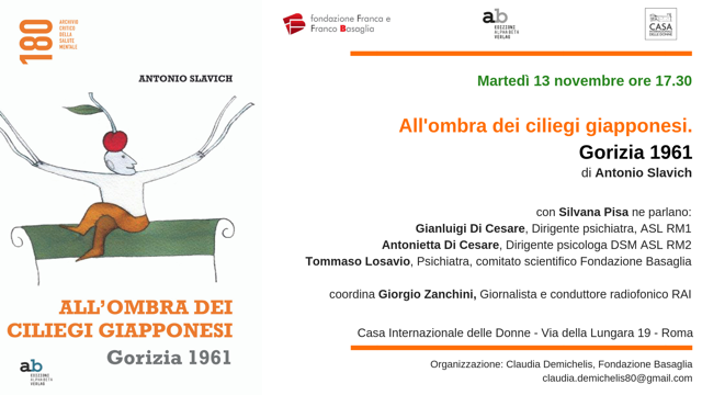 Martedì 13 novembre alle ore 17.30‚ presso la Casa Internazionale delle Donne‚ in Via della Lungara‚ 19 a Roma‚ verrà presentato il libro “All’ombra dei ciliegi giapponesi. Gorizia 1961” di Antonio Slavich (ed. Alpha Beta Verlag 2018) Si tratta di un racconto autobiografico incentrato sul percorso che portò alla chiusura dei manicomi. Slavich‚ infatti‚ nel 1962 fu chiamato a collaborare con Franco Basaglia nell’ospedale psichiatrico di Gorizia. Proprio da lì‚ e da quegli anni‚ iniziarono le prime riflessioni‚ i primi tentativi‚ anche i primi errori del lungo percorso che porterà‚ negli anni ottanta‚ alla chiusura degli istituti. La sua testimonianza racconta ad esempio della nascita dell’“Assemblea Goriziana”‚ dove gli internanti psichiatrici per la priva volta erano invitati a prendere la parola. E il progressivo formarsi‚ attorno a Basaglia e Slavich‚ di un gruppo di operatori che condividerà il percorso e tutte le battaglie che lo hanno costruito. Interverranno all’incontro con Silvana Pisa‚ Gianluigi Di Cesare‚ dirigente psichiatra ASL RM1‚ Antonietta Di Cesare‚ dirigente psicologica DSM ASL RM2 e Tommaso Losavio‚ psichiatra e facente parte del comitato scientifico Fondazione Basaglia. Modera l’incontro Giorgio Zanchini‚ giornalista e conduttore radiofonico RAI. L’incontro è organizzato da Fondazione Basaglia‚ casa Internazionale delle Donne e da Alpha Beta Verlag edizioni.