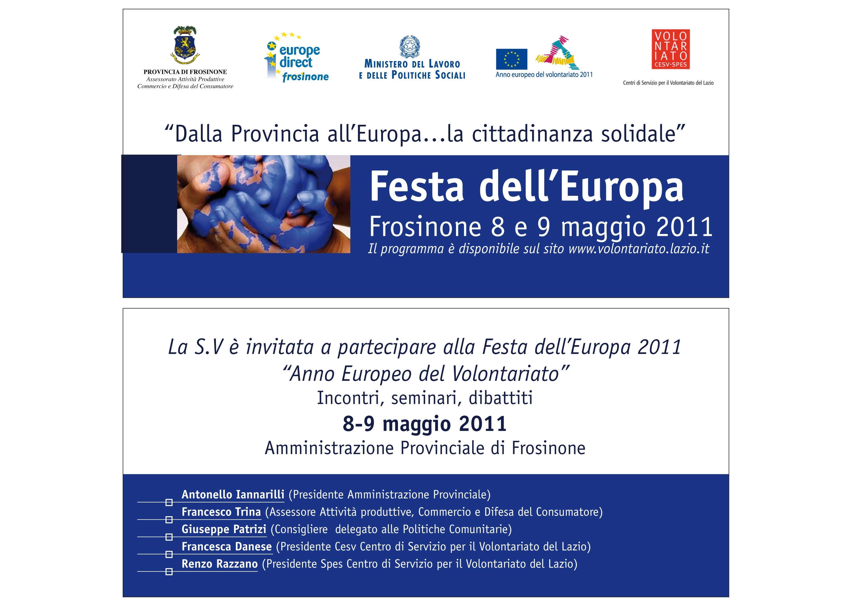 Dalla Provincia all’Europa...la cittadinanza Solidale questo il titolo della manifestazione prevista per i giorni 8 e 9 maggio 2011 a Frosinone. L’evento sarà animato da incontri‚ seminari‚ dibattiti e iniziative dedicate al tema della cittadinanza europea.