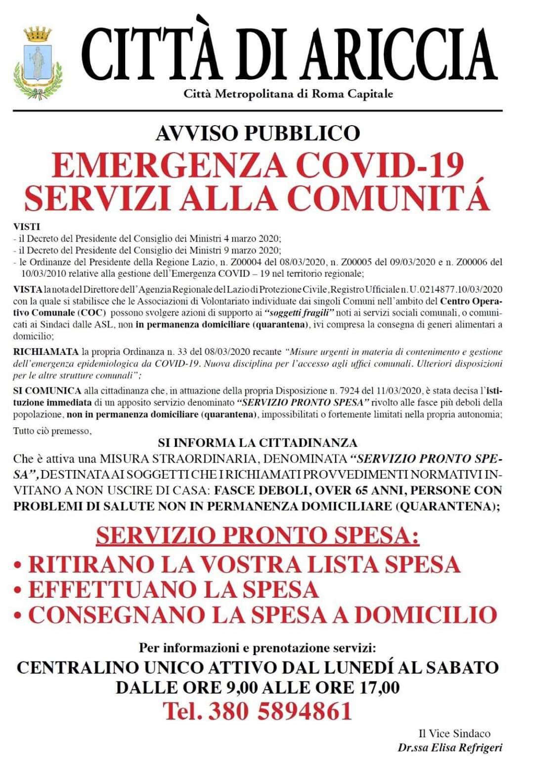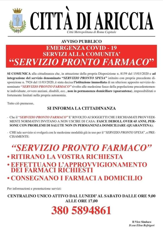 Confraternita di Misericordia di Ariccia‚ La Fenice 2010 Associazione di Protezione Civile‚ CRI Comitato dei Comuni dell’Appia e il Comune di Ariccia hanno organizzato il Servizio “Pronto Farmaco” e Servizio “Pronto Spesa”. Il servizio prevede raccolta richieste/ approvvigionamento/ consegna a domicilio di farmaci e/o spesa alle fasce deboli‚ agli anziani e alle persone con problemi di salute (non in quarantena). Per informazioni è possible contattare il cell. 380.5894861 dal lunedì al sabato dalle 9.00 alle 17.00