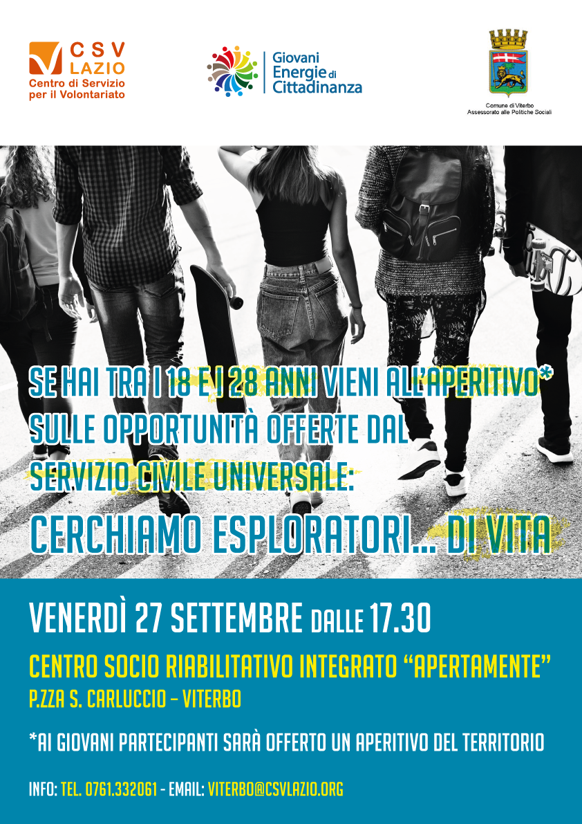 Venerdì 27 settembre 2019‚ a partire dalle 17.30‚ presso il Centro Socio Riabilitativo Integrato "Apertamente" in Piazza San Carluccio a Viterbo avrà luogo Esploratori di Vita. L'incontro informativo‚ organizzato da CSV Lazio‚ in collaborazione con l'Assessorato alle Politiche Sociali del Comune di Viterbo‚ è rivolto ai giovani di Viterbo per informarli riguardo alle opportunità offerte dal bando di Servizio Civile Universale attualmente in corso. Seguirà un aperitivo offerto in uno dei locali vicini.