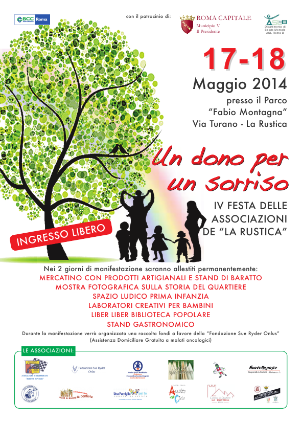 Il 17 e 18 maggio 2014 presso il Parco Fabio Montagna in Via del Turano a Roma‚ si terrà la IV Festa delle associazioni del quartiere La Rustica Un dono per un sorriso. L’ingresso è libero.