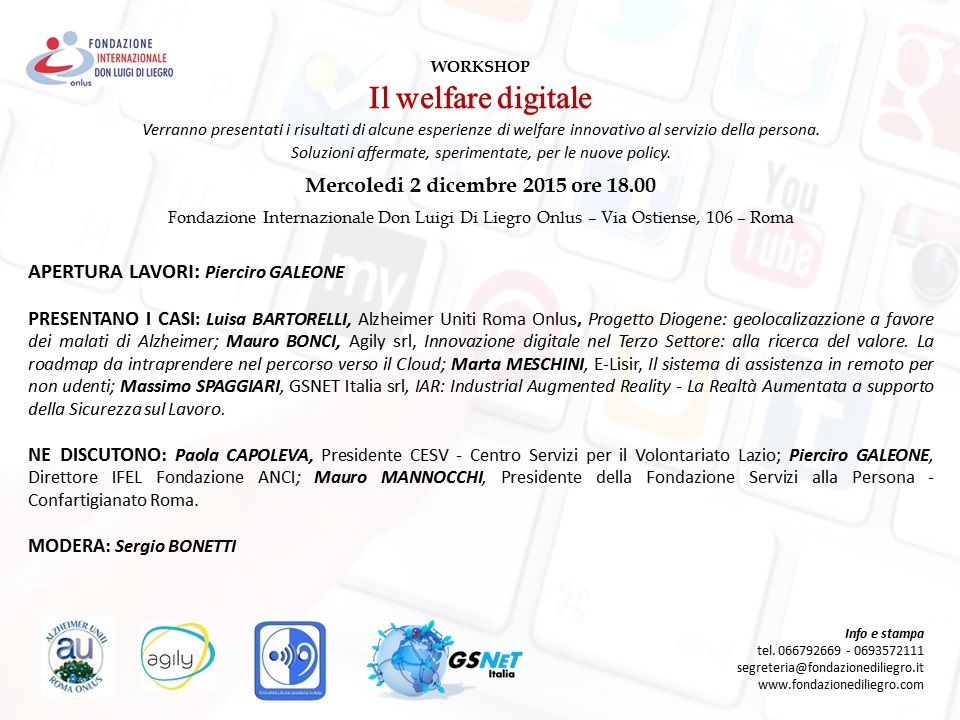 Di questi temi si parlerà il mercoledì 2 Dicembre alle ore 18.00 nell’ambito di un incontro dal titolo “Il Welfare digitale”‚ presso la Fondazione Don Luigi Di Liegro‚ in Via Ostiense‚ 106‚ a Roma.