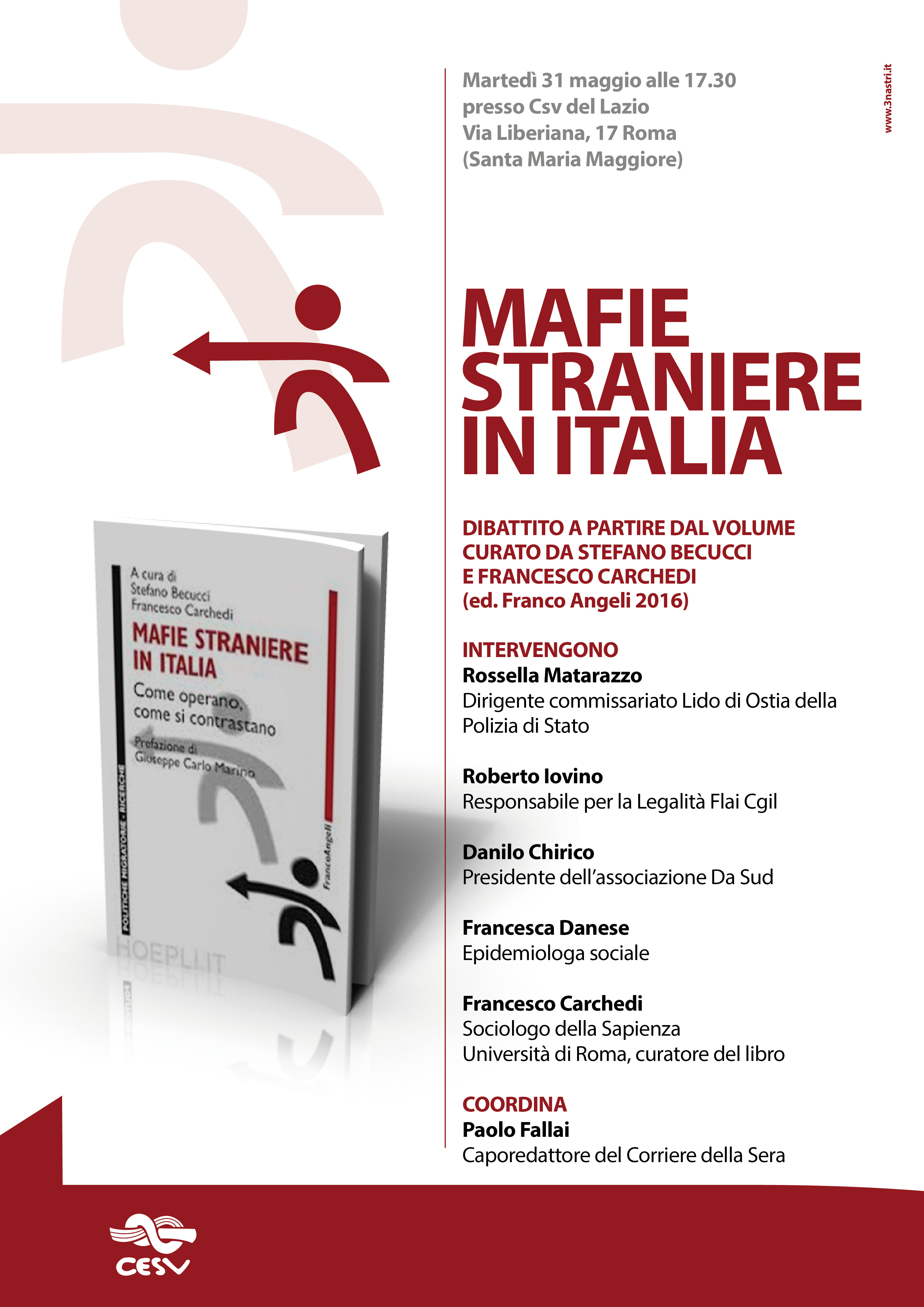 Welfare e Terzo settoreTrova in questo notiziarioCerca la notizia a partire da una parola chiave contenuta nel titolo o nel sottotitolo oppure in base al periodo di pubblicazione. Mafie straniere in ItaliaPresentazione del libro a cura di Stefano Becucci e Francesco Carchedi e dibattito 26/05/2016