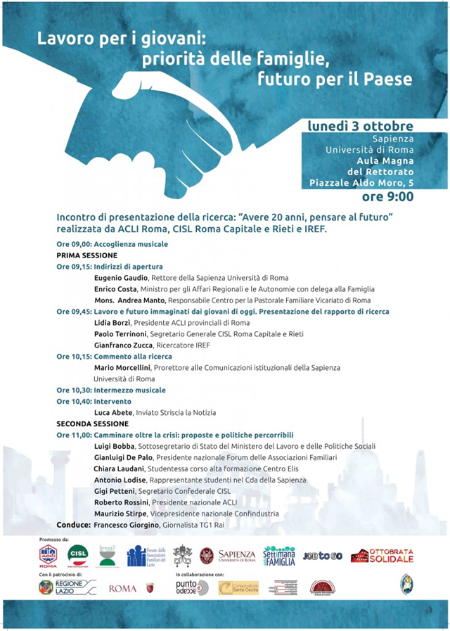 Appuntamento lunedì 3 ottobre 2016 alle ore 9.00 presso l’ Aula Magna de La Sapienza Università di Roma in Piazzale Aldo Moro‚ 5 con l’incontro dal titolo Lavoro per i giovani: priorità delle famiglie‚ futuro per il Paese.