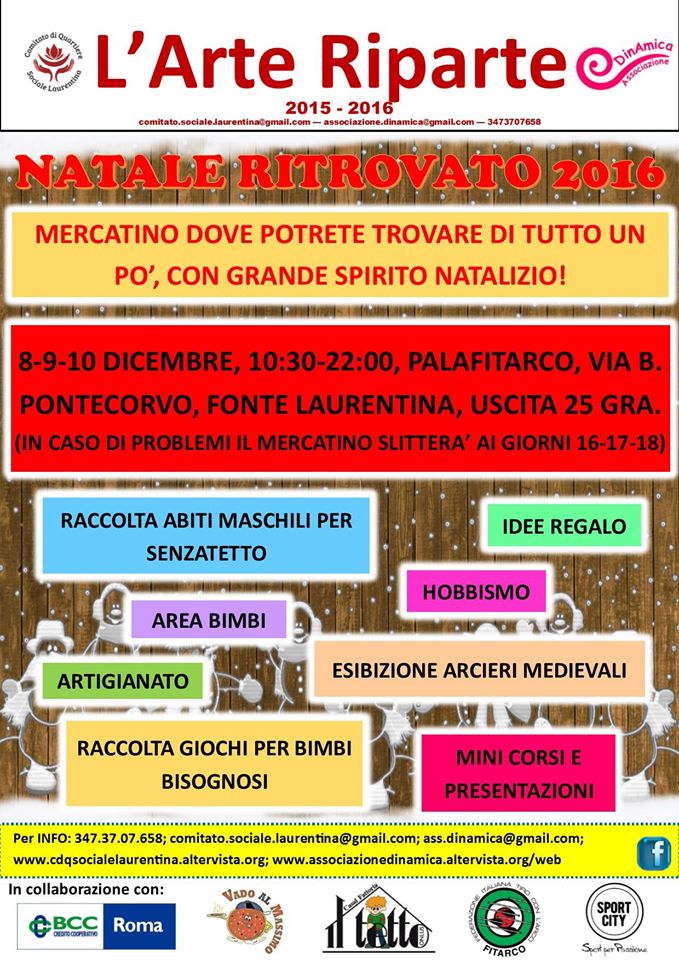 Il CdQ SL - Comitato di Quartiere Sociale Laurentina invita giovedì 8‚ venerdì 9 e sabato 10 dicembre 2016 all’iniziativa il Natale Ritrovato. Per tre giorni‚ presso il Palafitarco in via Bruno Pontecorvo (uscita 25 del GRA) a Roma‚ dalle ore 10.30 alle 22.30 tanti saranno gli appuntamenti in programma: mercatino solidale‚ hobbismo‚ artigianato‚ raccolte di beneficenza‚ adozioni animali‚ attività didattiche e molto altro.