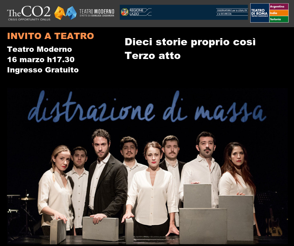 L’associazione CO2 Crisis Opportunity Onlus si occupa in collaborazione con altri enti del progetto Il Palcoscenico della legalità‚ un progetto nazionale di collaborazione tra teatri‚ istituti penitenziari minorili‚ scuole‚ università e società civile e che usa il teatro come strumento di educazione alla legalità . Parte fondante del progetto è lo spettacolo “Dieci storie proprio così” ‚ terzo atto di Giulia Minoli ed Emanuela Giordano che verrà messo in scena sabato 16 marzo alle ore 17.30 al Teatro Moderno di Latina (Via Sisto V‚ 04100) con ingresso gratuito. Al progetto è legato anche il documentario “Dieci storie proprio così” prodotto da Rai Cinema e JMovie‚ che ripercorre le tappe del progetto‚ vincitore del premio speciale ai Nastri d’Argento 2018. Cliccando qui il link per la visione.