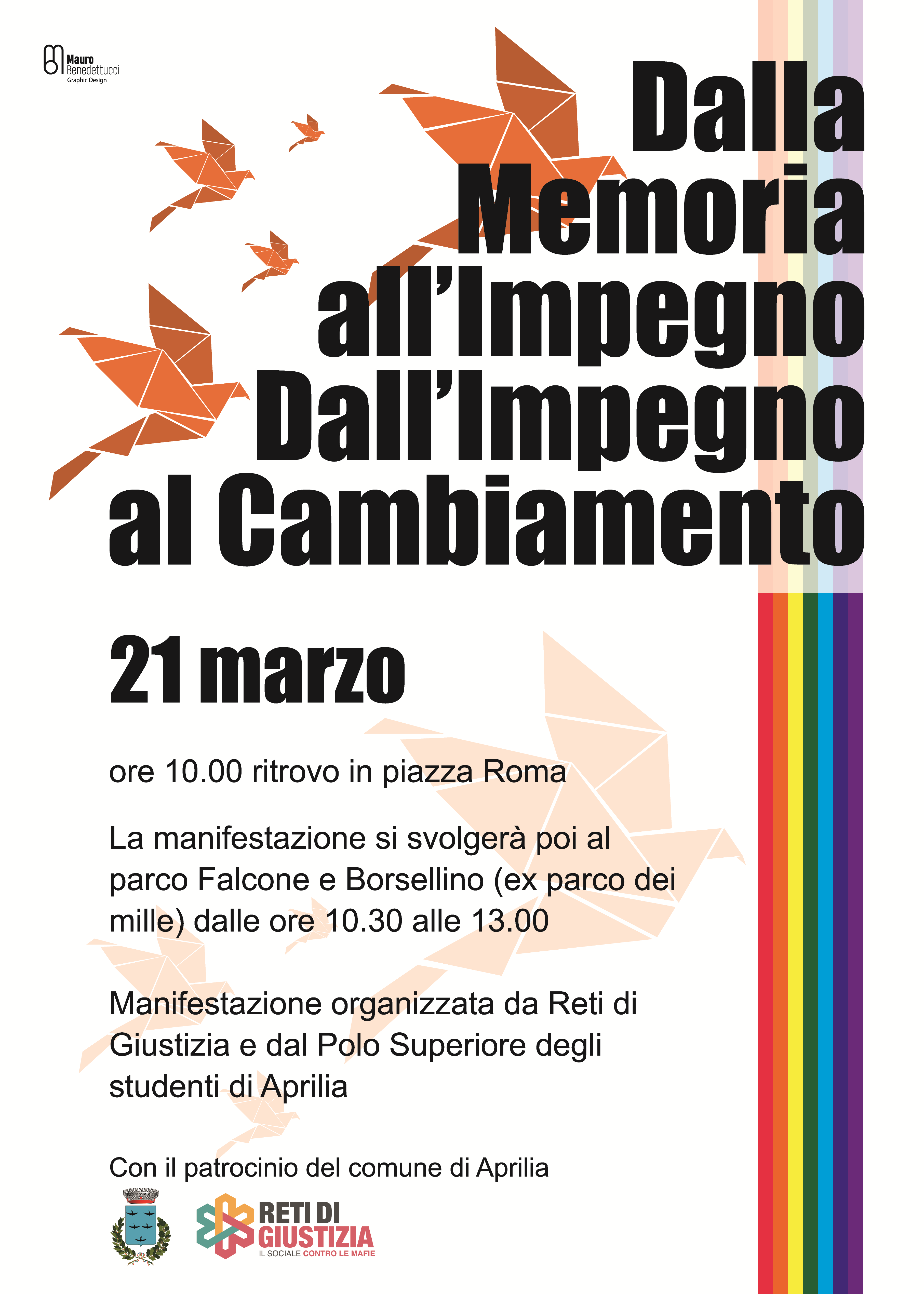 Il 21 marzo‚ Giornata della Memoria e dell’Impegno in ricordo delle vittime innocenti delle mafie‚ l’associazione Reti di Giustizia - il sociale contro le mafie si è fatta promotrice‚ assieme al Polo Superiore degli studenti di Aprilia‚ dell’organizzazione di una manifestazione cittadina che si terrà ad Aprilia e che vede il coinvolgimento e la partecipazione attiva delle scuole e degli istituti superiori della città come il Liceo A. Meucci e l’Istituto C. & N. Rosselli‚ la Scuola Secondaria di primo grado A.Gramsci e numerose associazioni : Movimento dei Focolari di Aprilia; A.N.P.I – Sezione di Aprilia “V. Arrigoni”; Azione Cattolica Diocesi di Albano; Centro Sportivo Italiano - Latina; La Frusta - Politica e Cultura; Enjoy Progress; Associazione Nazionale Sociologi; Arte Mediterranea‚ Associazione Atena‚ Soci Coop‚ Associazione Arci “La Freccia”‚ Aifo Latina Onlus. L'iniziativa ha il patrocinio del Comune di Aprilia. L'intera iniziativa è stata pensata e organizzata con il fine di rendere protagonisti dell'iniziativa gli studenti stessi e in modo tale da far partecipare tutte quelle realtà che nella città di Aprilia si rendono portatrici di valori‚ ideali e azioni riconducibili ai principi della giustizia sociale e della lotta alla corruzione e al pensiero mafioso; durante il corso della manifestazione ci saranno esibizioni musicali e teatrali‚ letture di testi e altre attività tutte inerenti al tema della giornata. La manifestazione è‚ tra l’altro‚ solo uno dei primi punti di arrivo di un lungo percorso di confronto‚ formazione e sensibilizzazione che si è svolto e si continuerà a svolgere per e con gli studenti‚ i quali non possono che essere il motore del cambiamento che associazioni come Reti di Giustizia cercano di realizzare nella società. La manifestazione si articolerà come segue: - luogo di incontro: Piazza Roma - ore 10‚00; - luogo di svolgimento dell'iniziativa : Parco Falcone e Borsellino – dalle ore 10‚30 alle ore 13‚00.