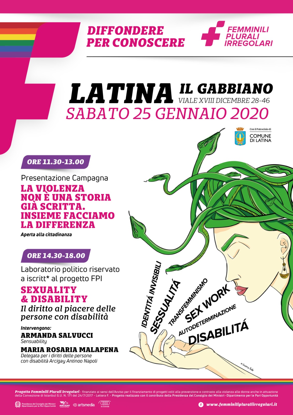 L'associazione “SeiComeSei onlus” Arcigay Latina invita a partecipare alla presentazione del progetto: “Femminili Plurali Irregolari” (www.femminilipluraliirregolari.it)‚ finanziato ai sensi dell'avviso per il finanziamento di progetti volti alla prevenzione e contrasto alla violenza alle donne anche in attuazione della convenzione di Istanbul G.U. N. 171 del 24/7/2017 – Lettera F e promosso da Arcigay‚ La Cicloide e Artsmedia con l'obiettivo di sensibilizzare l'opinione pubblica sul tema della violenza subita dalle donne lesbiche‚ bisex‚ con disabilità e sulle persone trans. Nel corso della giornata verrà lanciata la campagna “La violenza non è una storia già scritta. Insieme facciamo la differenza”‚ frutto di un intenso e stimolante lavoro di co-costruzione tra attivisti di tutta italia. L’evento si terrà sabato 25 gennaio dalle ore 11.30 nella Sala Comunale “Ex Tipografia il Gabbiano” di Latina‚ viale XXVIII Dicembre e sarà così articolato: Ore 11:30 Presentazione campagna “La violenza non è una storia già scritta insieme facciamo la differenza” Intervengono: Patrizia Ciccarelli - Assessora Pari opportunità e Welfare Marta Bonafoni - Consigliera regionale Maria Pia Pizzolante – Futura Ore 13:00 – 14:00 lunch Ore 14:30 – 18:00 Laboratorio politico con ospiti "Sexuality&Disability - Il diritto al piacere delle persone con disabilità” Intervengono: Maria Rosaria Malapena - Delegata per i diritti delle persone con disabilità di Arcigay Napoli Armanda Salvucci – Sensuability