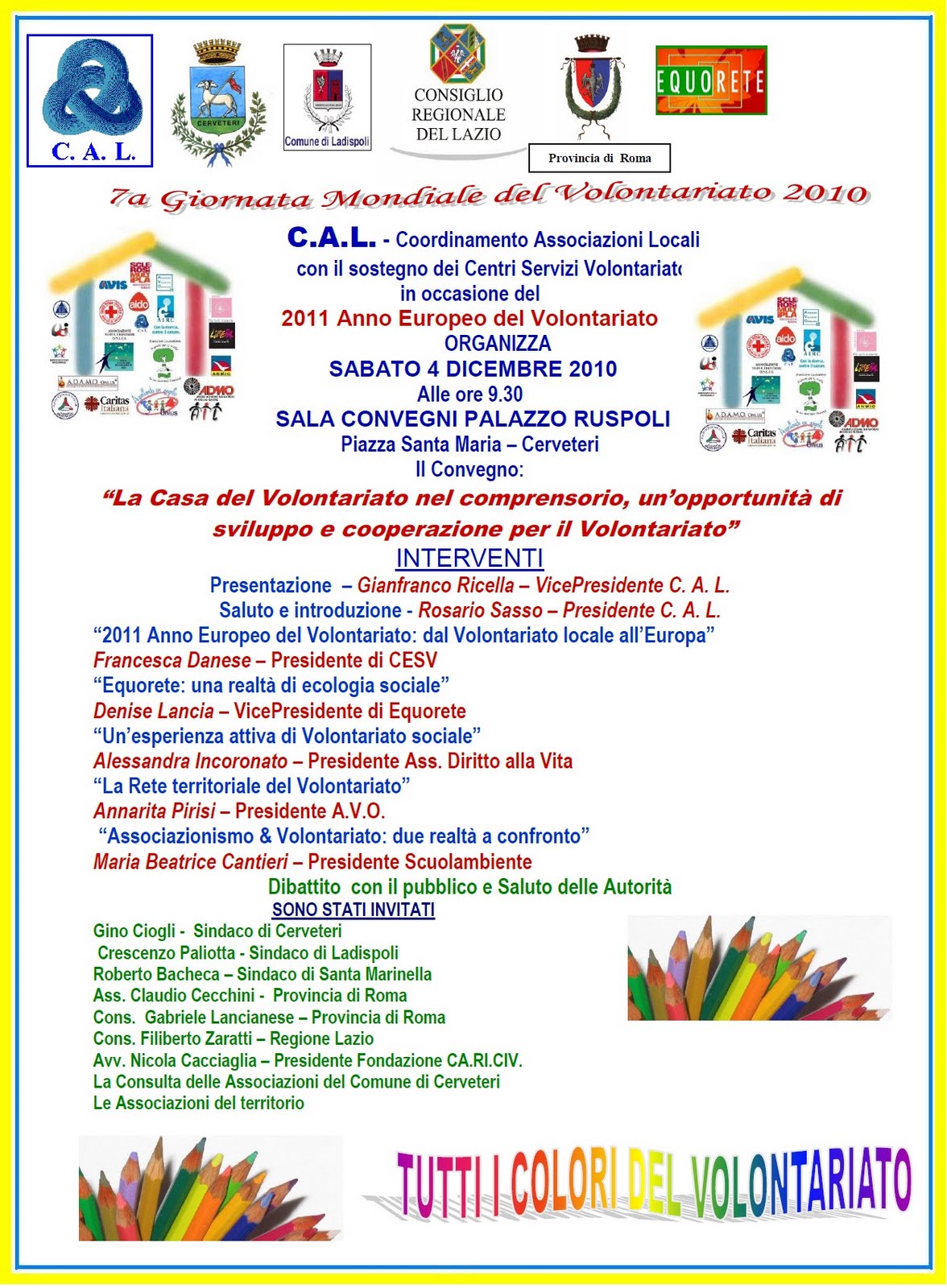 In occasione della VII giornata mondiale del volontariato il C.A.L.‚ Coordinamento Associazioni Locali con il sostegno dei Centri di Servizio per il Volontariato del Lazio Cesv e Spes ha organizza il convegno intitolato La casa del Volontariato nel comprensorio‚ un’opportunità di sviluppo e cooperazione per il Volontariato.