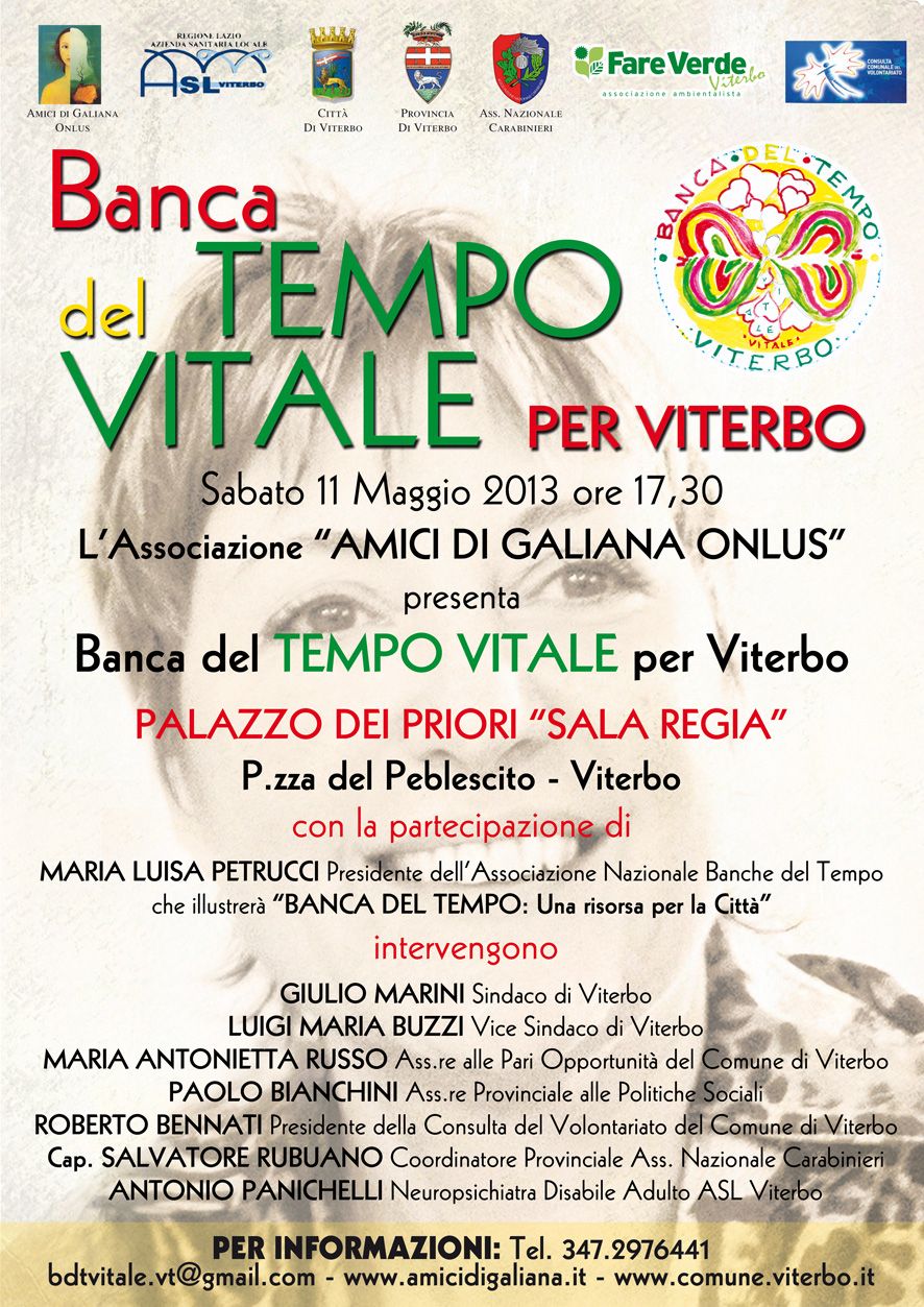 Sabato 11 maggio 2013 alle ore 17.30 nella Sala Regia del Comune di Viterbo (Palazzo dei Priori‚ Piazza del Plebiscito)‚ nell’ambito della Settimana del Volontariato‚ è in programma un convegno con la partecipazione della presidente dell’Associazione nazionale delle Banche del Tempo che parlerà sul tema Banca del Tempo: una risorsa per la città‚ per promuovere il progetto in corso di attuazione dell’associazione Amici Di Galiana onlus di Viterbo con l’obiettivo di creare la Banca del Tempo VITALE per Viterbo.