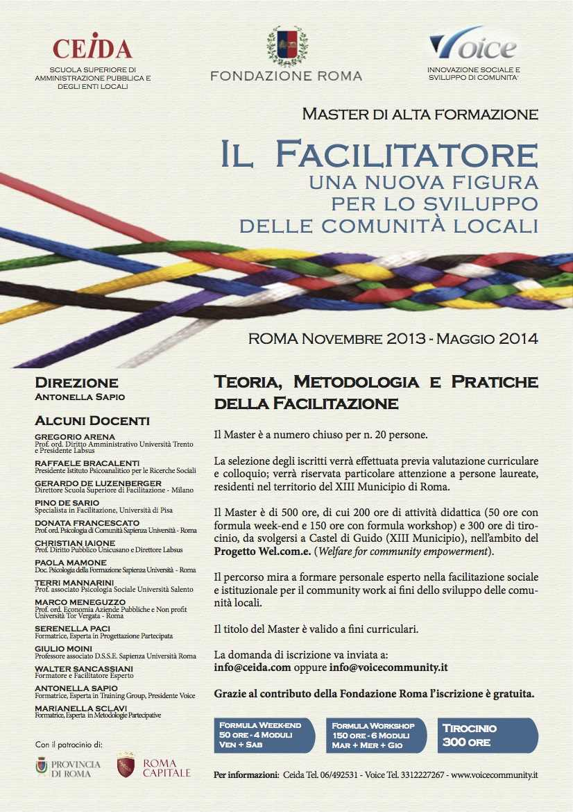 Si svolgerà a Roma tra novembre 2013 e maggio 2014 il Master di alta formazione Il Facilitatore promosso da Voice e dal Ceida con il sostegno della Fondazione Roma e con il patrocinio di Roma Capitale e Provincia di Roma.