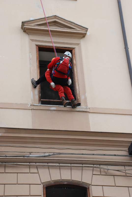Particolare di salvataggio da un edificio, in un piano elevato, con sostegno da parte di un operatore della Associazione "Giannino Caria", Protezione Civile
