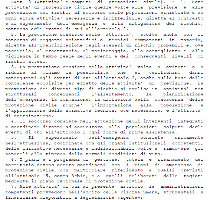 Nel Sistema della Protezione Civile è coinvolta tutta l'organizzazione dello Stato, dai Ministeri al più piccolo Comune, oltre alla società civile che partecipa attivamente attraverso le Organizzazioni di volontariato.   Attività del sistema NazionaleLa legge 225/1992 ha stabilito che le attività del Sistema riguardano previsione, prevenzione, soccorso e superamento dell'emergenza in relazione agli eventi, classificati di tipo a), di tipo b) e di tipo c). Evento di tipo a) - si tratta di eventi che colpiscono un territorio in cui il Sindaco ha il compito di provvedere ad assicurare i soccorsi alla popolazione coordinando le strutture operative locali. Evento di tipo b) - prevedono il coinvolgimento, su richiesta del Sindaco, della Provincia, della Prefettura e della Regione che mettono a disposizione le risorse di cui dispongono. Eventi di tipo c) - si tratta di eventi che per le loro dimensioni e per le relative conseguenze, su richiesta della Regione, viene dichiarato lo stato di emergenza ed il coordinamento degli interventi viene assunto dalla Presidenza del Consiglio dei Ministri e gestito dal Dipartimento. Il DL 59/2012 e la relativa conversione in Legge n° 100/2012 stabilisce, all'art. 3, stabilisce che Sono attività di Protezione Civile quelle volte alla previsione e alla prevenzione dei rischi, al soccorso alle popolazioni sinistrate e ad ogni attività necessaria e indifferibile, diretta al contrasto e al superamento dell'emergenza e alla mitigazione del rischio, connessa agli eventi di cui all'art. 2. La previsione consiste nelle attività dirette alla identificazione degli scenari di rischio probabili e, dove possibile, al preannuncio, al monitoraggio, alla sorveglianza e alla vigilanza in tempo reale degli eventi e dei conseguenti livelli di rischio attesi. La prevenzione consiste nell'attività volta da evitare o a ridurre al minimo la possibilità che si verifichino danni conseguenti agli eventi; si esplica attraverso l'allertamento, la pianificazione dell'emergenza, la formazione, la diffusione della conoscenza della Protezione Civile, l'informazione alla popolazione, l'attività di esercitazione. Il soccorso consiste nell'attuazione degli interventi integrati e coordinati diretti ad assicurare alle popolazioni colpite dagli eventi la prima assistenza. Il superamento dell'emergenza, consiste nell'attuazione, coordinata con gli organi istituzionali competenti, delle iniziative volte a rimuovere gli ostacoli alla ripresa delle normali condizioni di vita.   |
